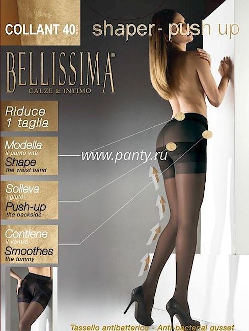 Чорапогащник Bellissima 40 DEN Collant shaper-push up със стягаща корема лента и памучен клин за сигурност и комфорт. Има ограничители на пръстите.